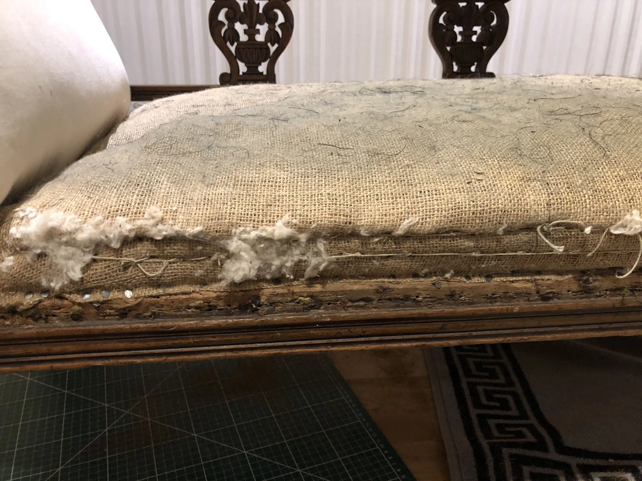 The piece had been shortened at some stage in its lifetime and the springs had wedged themselves under the piece of wood which attached the long sides of the piece together. As a result the seat had collapsed at one end.